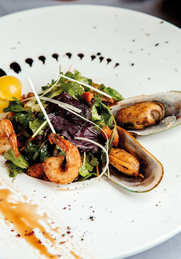 Un banchetto degno dell’Olimpo dei mari Pomodoro, mozzarella, gamberi grigliati, code di gambero al vapore, patate lesse; dopo cottura: pinzimonio di verdure, concassé di pomodoro, battuto di erbe